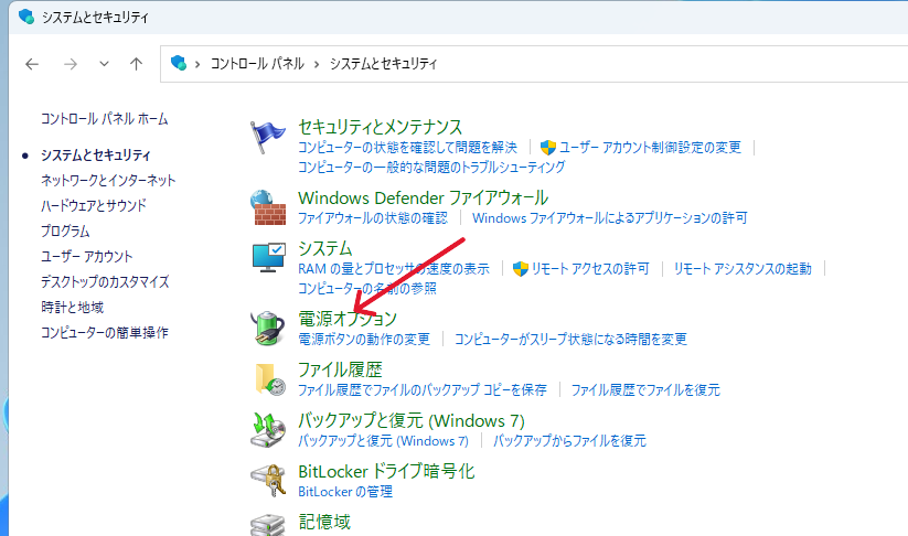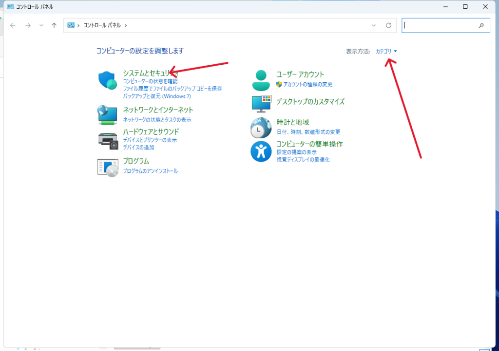 表示方法をカテゴリにあわせて、システムとセキュリティをクリックする