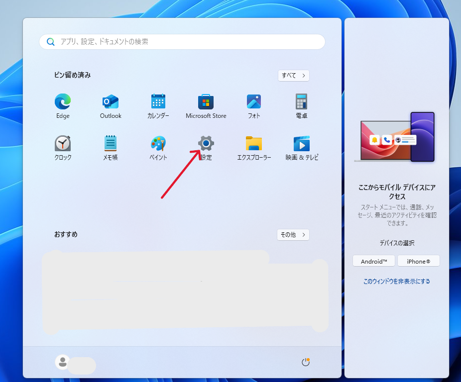 再起動したらスタート(Windowsマーク)から設定をクリックする